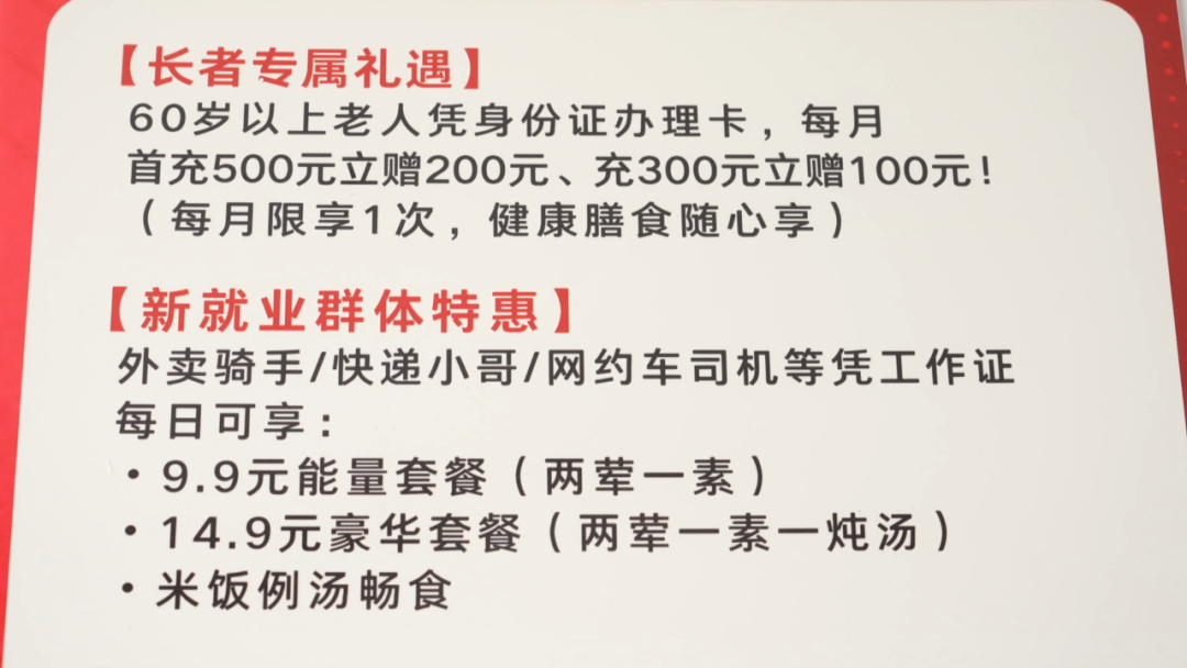 防浮泛全体做了从头拆修,勾当办还添置了新风系统,居平易近用餐时整个会比力干燥、比力透气。我们针对两个群体做了一些专属优惠,一个是针对60岁以上的供给一个500送200、 300送100的充值优惠。然后针对一些新就业群体,好比说像快递小哥、美团小哥和开滴滴的滴滴司机有特地推出了一个9块9和14块9的套餐。